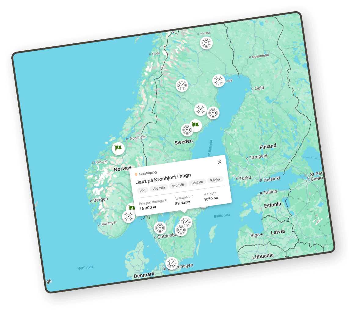 Registrera dig för att hitta jakttillfällen, skapa jaktlag, bjuda på jakträtter och sälja jakter!